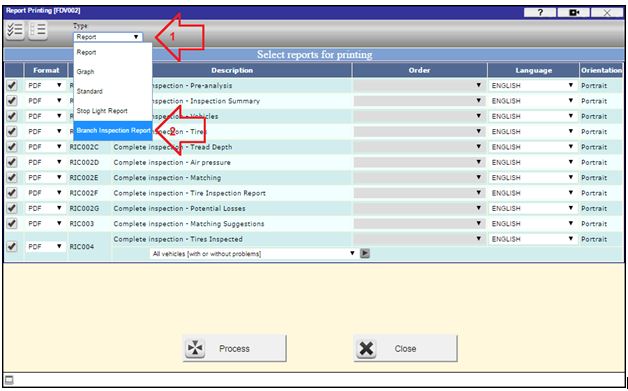 2. 5.On the Report Printing screen, click on the Type (1) drop-down menu and select the Branch Inspection Report (2) option: